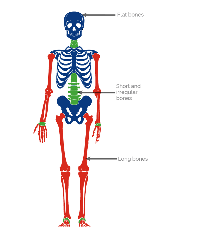 Bones can be categorized according to their shape into long, flat, and irregular bones.