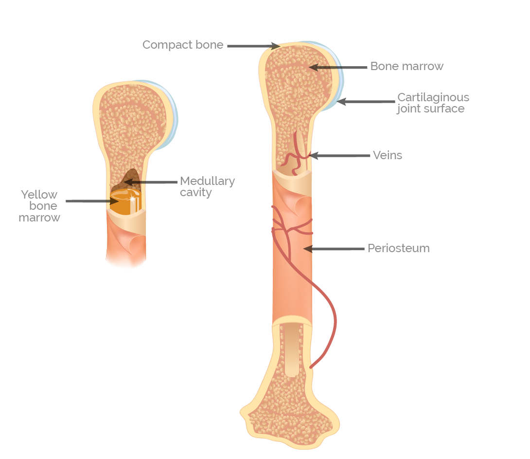 Under the periosteum is the compact bone, followed by the small bone plates and trabeculae that make up the trabecular bone. The trabecular bone is able to transform depending on its load. Long bones also each have a medullary cavity inside, which contains the yellow bone marrow, composed mostly of adipose tissue. Flat and irregular bones have no medullary cavity, but their trabecular bones contain the red bone marrow, which plays an important part in haematogenesis.