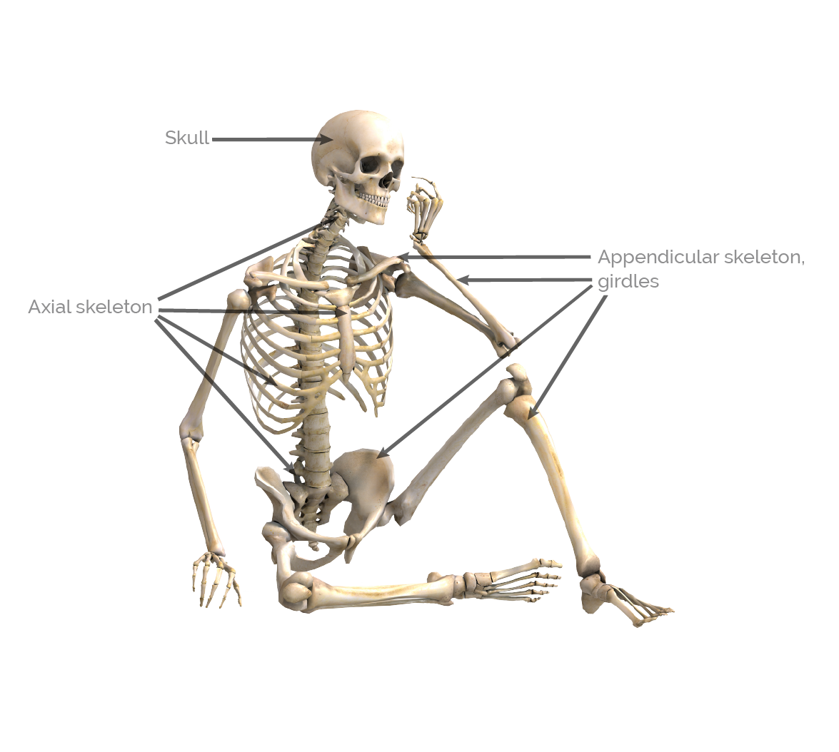 The human skeleton is made up of approximately 206 bones. The skeleton not only supports the body, but also protects the interior organs, while also providing storage for calcium, as well as playing an important role in haematogenesis. The main parts of the skeleton are the skull, the axial skeleton, the appendicular skeleton and the girdles.