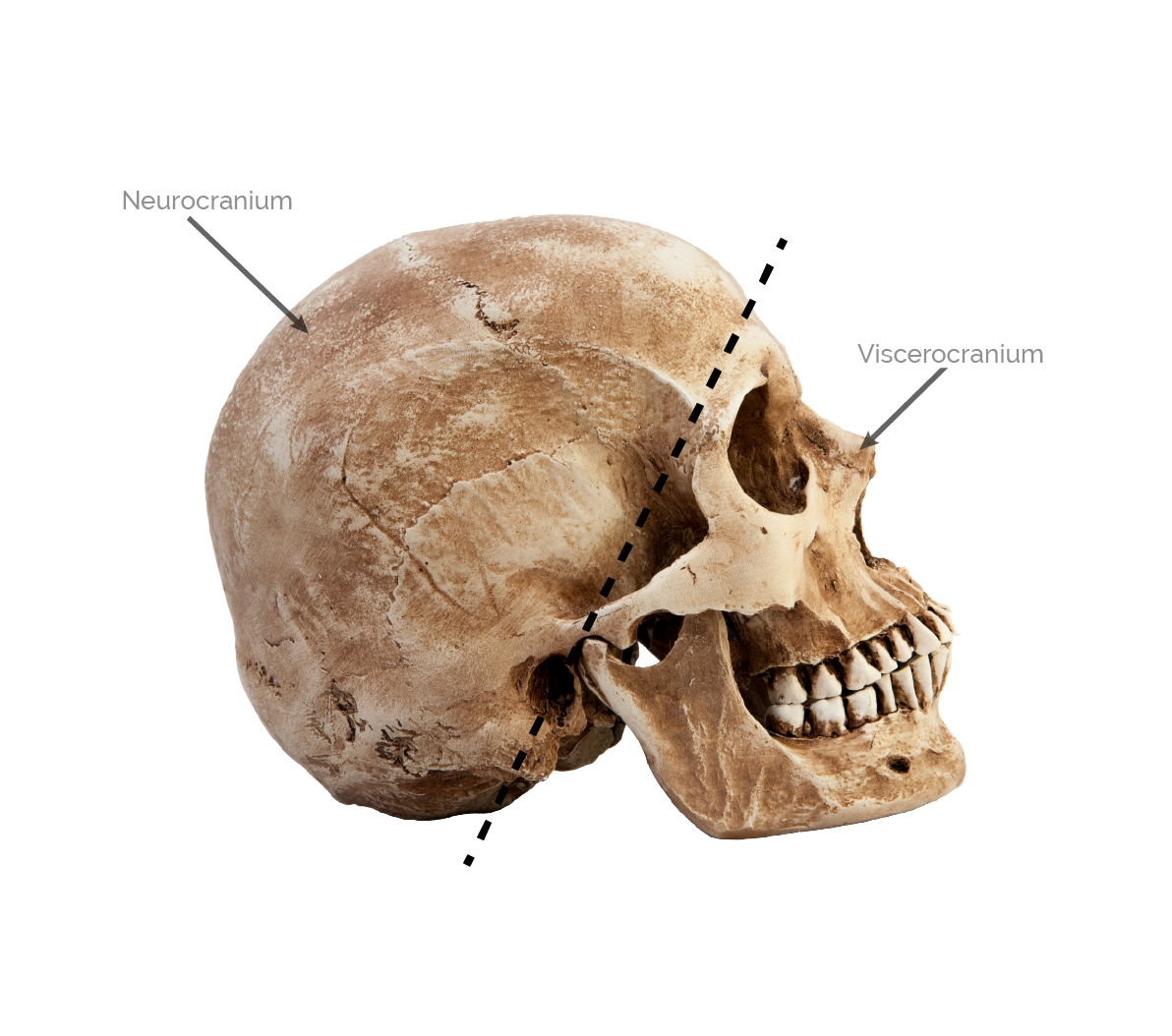 The skull’s two main parts are the neurocranium, which protects the brain, and the viscerocranium, which is located at the front. Both are made up of a number of different bones. The skull is connected to the spinal column by the occipital area, allowing movement. The bones of the skull usually can not be moved separately, with the exception of the jaw, which is connected to the neurocranium by a joint.