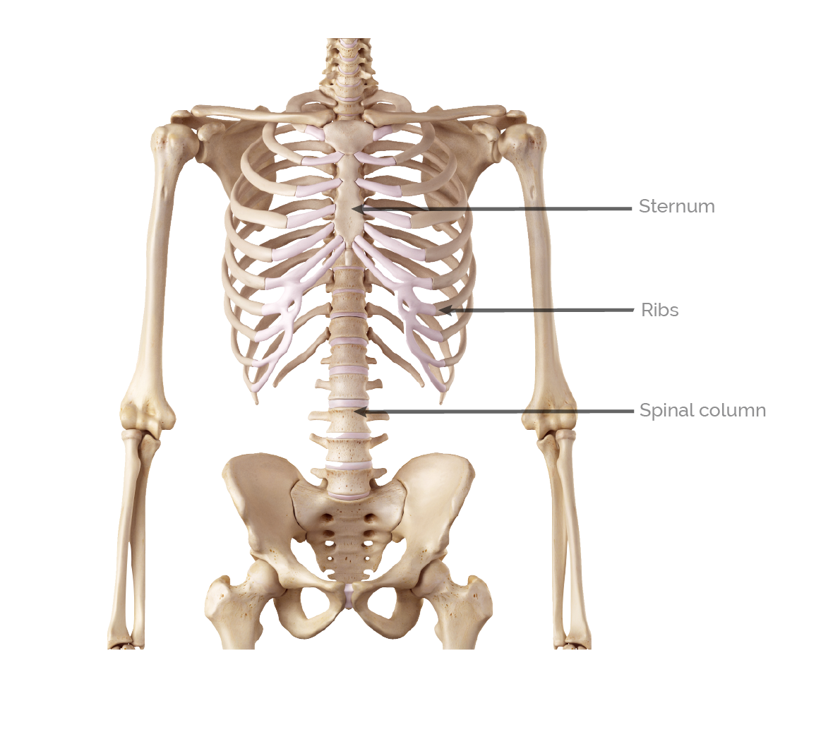 The axial skeleton is made up of the spinal column (which consists of the vertebrae), the ribs, and the sternum. The spinal column is the skeleton’s axis, and is composed of 32-34 vertebrae, part of which have mobile connections in between them, and part of which are merged. The cavities inside vertically aligned vertebrae together form a protective channel, in which lies the spinal cord. The 12 pairs of ribs articulate with the vertebrae in the back, and with the exception of two pairs of false ribs, are connected to the sternum by a cartilaginous connection. The vertebrae, the ribs, and the sternum together form the chest.