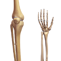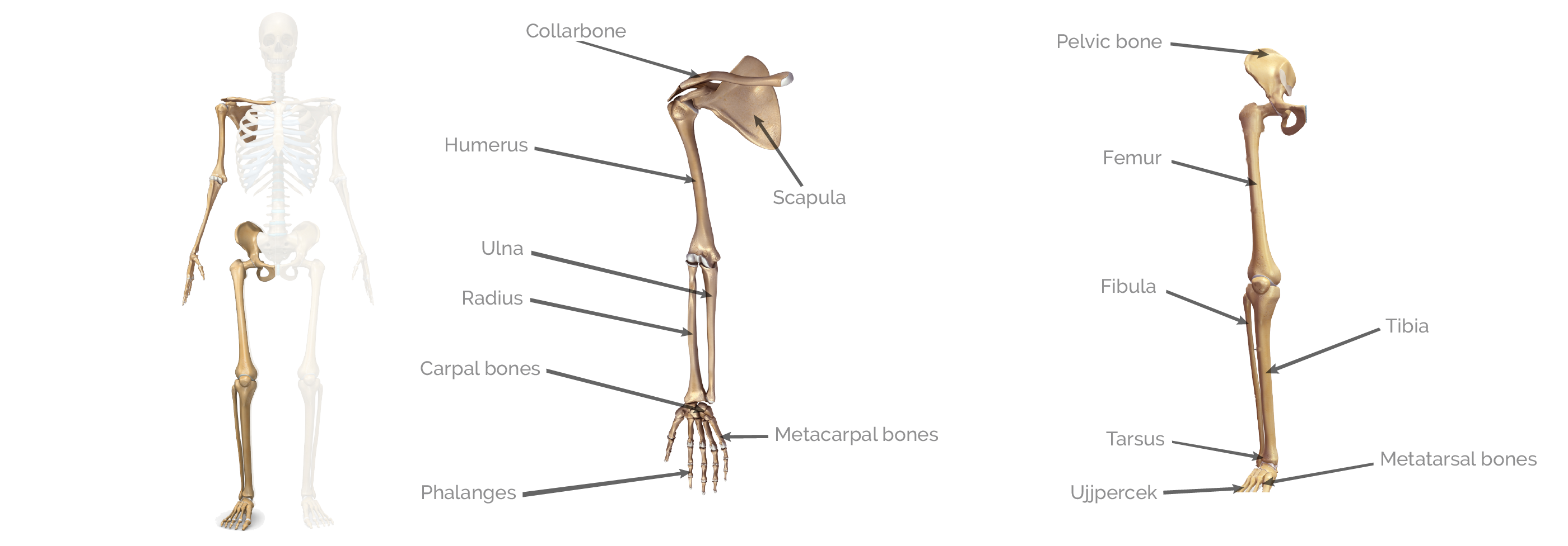 The girdles’ job is to connect the limbs to the axial skeleton. The girdle connecting the arm is the shoulder girdle, which is made up of the scapulae and the collarbones. The legs are connected to the trunk by the pelvic girdle. The arm bones are the humerus (which is connected to the girdle), the radius, the ulna, the 8 tiny carpal bones (which make up the wrist joint), the metacarpal joints (which form the frame of the palm), and the phalanges. In the skeletal system of the leg, the femur, which is the longest bone in the body, is connected to the pelvic girdle, followed by the tibia and the fibula, which together form the shin. The bones of the tarsus are all small in size with the exception of the calcaneus, and make up the ankle area. The skeletal frame of the