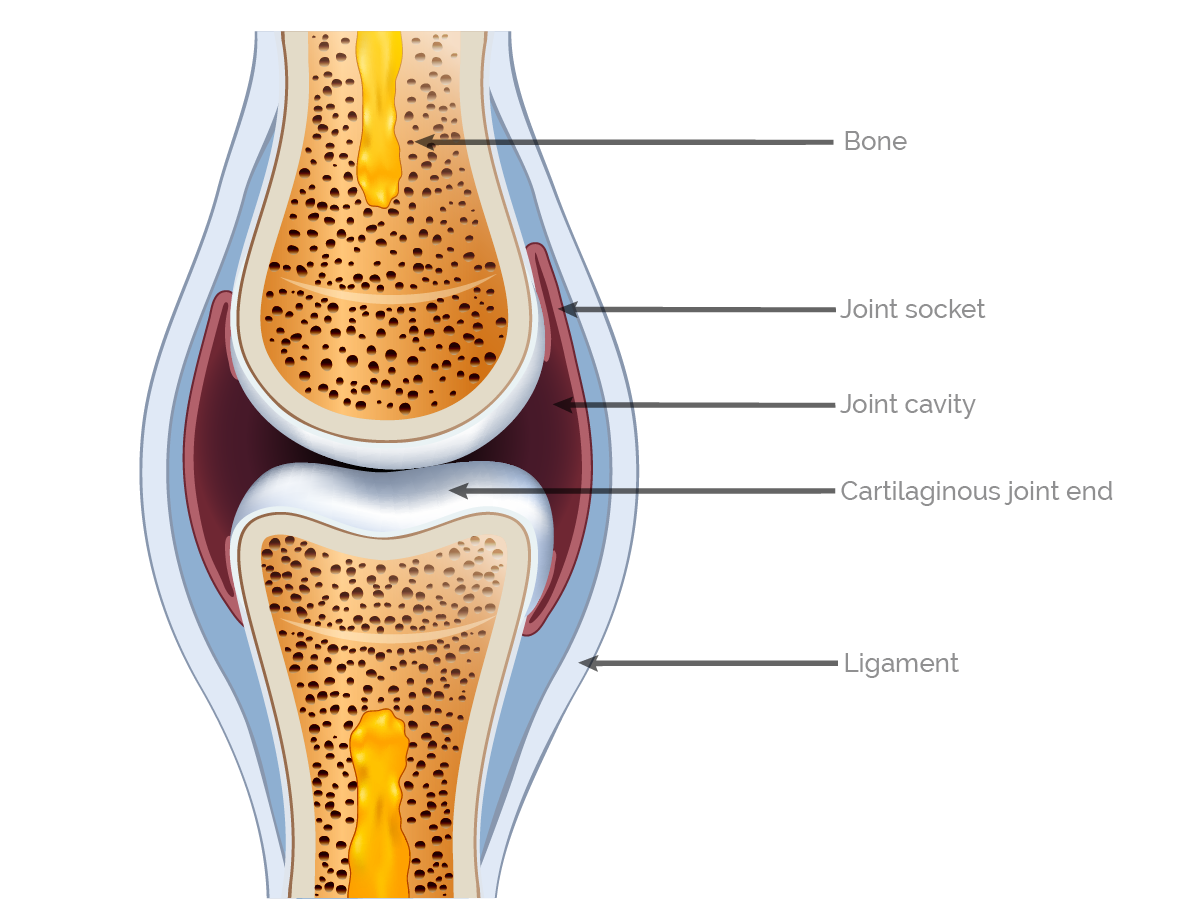Joints are mobile connections between bones, in which two or more bones are connected to one another. The surface of the articulating bones is covered with smooth cartilage. The bone ends are connected by the joint socket. The cells located in the socket’s interior layer produce synovial fluid, which prevents bone surfaces from touching, and decreases friction between the moving bones. The joint ligaments connect the bone ends, and enhance the solidity of the joint. The shape of the articulating bones’ surface determines the possible directions of movement.