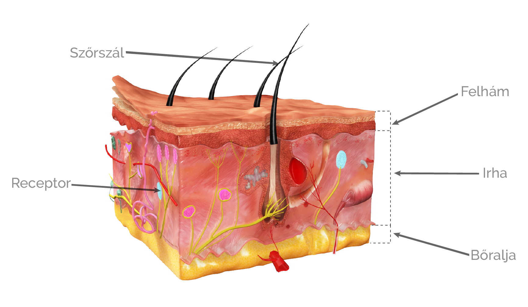 A bőr elválasztja a test belső részeit a külvilágtól, az első védelmi vonalat jelenti a kórokozókkal és az egyéb károsító hatásokkal, például a napfény ultraibolya sugaraival szemben. Sokféle Idegvégződés, módosult idegsejt, amely képes a környezetből származó ingerek érzékelésére, és ingerületként való továbbítására az idegrendszer felé.receptort tartalmaz, amelyek fontos információkat közvetítenek a külső környezetből. Mindezeken felül szerepe van a belső környezet állandóságának fenntartásában is, hiszen részt vesz a hőszabályozásban, a test víz- és sótartalmának alakításában. Három réteg alkotja: a felhám, az irha és a bőralja. A felhám szaruképződményei a szőrszálak és a körmök.