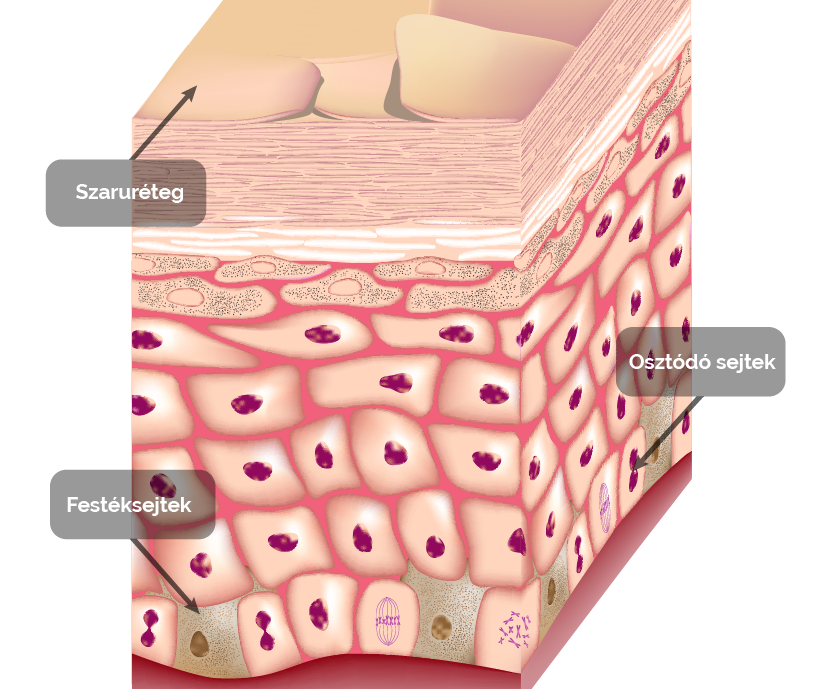 A bőr felszínét A hámszövetek egyik típusa, amely a szárazföldi gerincesekre jellemző. Nevét onnann kapta, hogy az osztódó sejtek felett több rétegben helyezkednek el a hámsejtek, a szövet tetején pedig védelmet biztosító szaruréteg található.többrétegű elszarusodó laphám alkotja, hámrétegnek is nevezik. Az alsó réteg sejtjei gyorsan osztódnak, az újonnan képződő sejtek felfelé nyomulva pótolják a bőr felső, folyamatosan kopó, pusztuló rétegét. A felfelé nyomuló sejtekben Rostos szerkezetű, rendkívül ellenálló fehérje, amely az emberben a bőr felszínén található, de ez építi fel a szőrszálakat, hajszálakat és a körmöket is. Az állatvilágban más képződmények, plédául szarv, pata, vagy csőr alkotásában is részt vesz.szaruszemcsék képződnek, a legfelső réteget az elhalt, elszarusodott sejtek maradványai alkotják. A szaruréteg vízhatlanná teszi a bőrt, megakadályozza a szervezet vízvesztését, kiszáradását. Vastagsága erősen függ az igénybevételtől, a tenyér és a talp területén a legvastagabb. A hám alsó rétegben találhatók a bőr színét adó festéksejtek is. A Másik nevük melanociták. A hámréteg jellemző festékanyagát,a melanint termelik, amely a többi sejtbe kerülve színezi a bőrt, szőr-, vagy hajszálakat.festéksejtek által termelt sötét festékanyag szerepe a bőr védelme az ultraibolya sugaraktól, ezért ha sokat tartózkodunk napon a bőrünk sötétebb lesz, „lebarnul”.