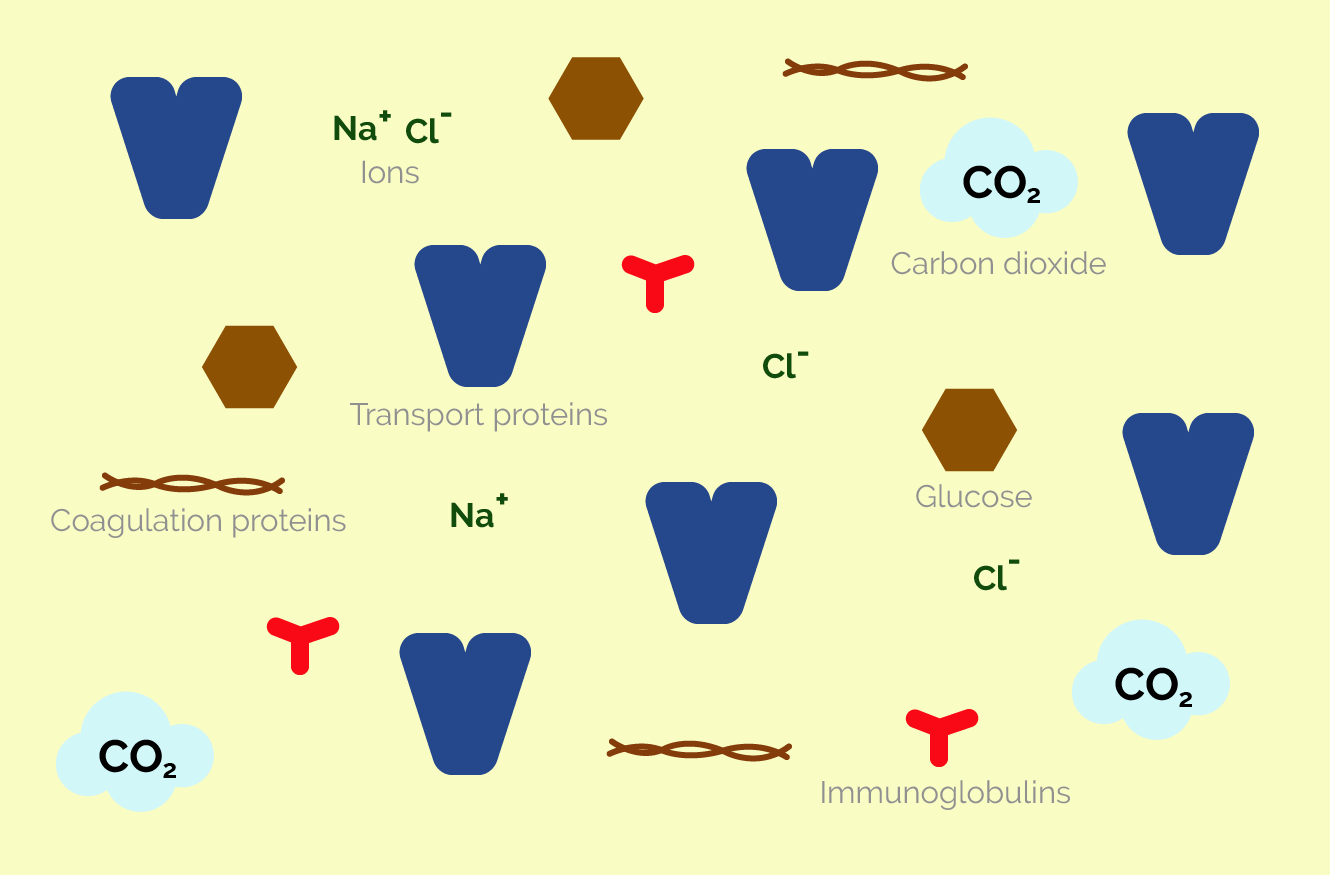 The main component of blood plasma is water. The blood’s cellular elements are transported suspended in this yellowish fluid, which contains a variety of ions and organic substances. Some of its proteins are transport proteins which can bind hormones, fatty acids and different metallic ions. Immunoglobulins are proteins that take part in the defense against foreign substances that enter the body (antigens), while other proteins have a role in coagulation. Carbon dioxide, a gas we breath out, is also transported by the blood plasma. Examining the composition of blood plasma (protein content, ion composition, blood sugar level) gives us important information about our health.